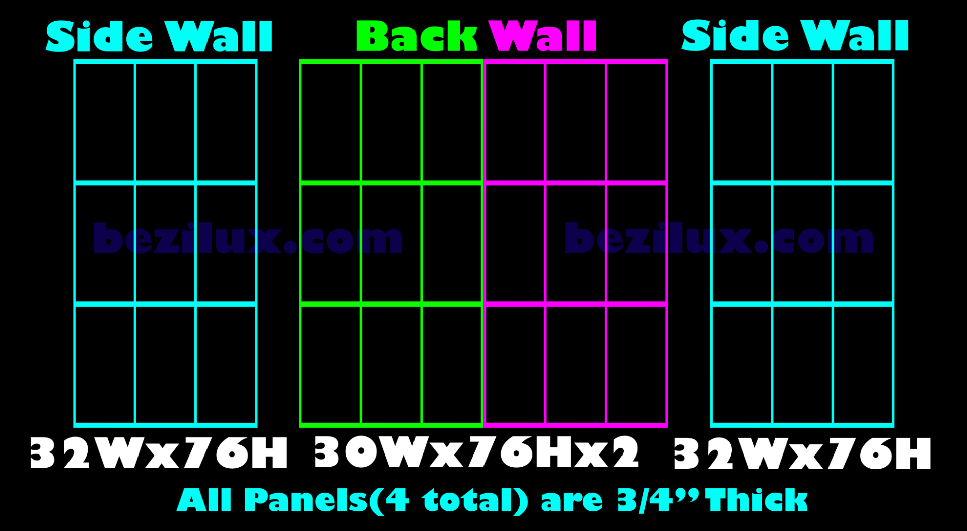 78" H x 30" W x 3/4" D X 2 Qty - Side Panels78" H x 30" W x 3/4" D X 2 Qty - Back Panels